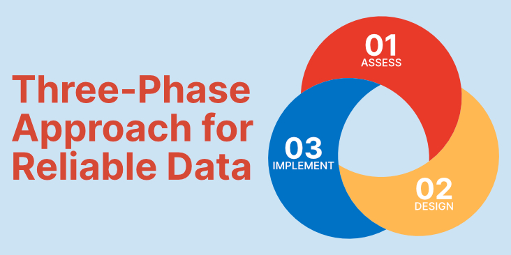 To make data and AI initiatives repeatable and reliable, CorSource uses a three-phase architecture framework that delivers a structured path from vision to working systems. The framework uses three phases: Assess, Design, and Implement.